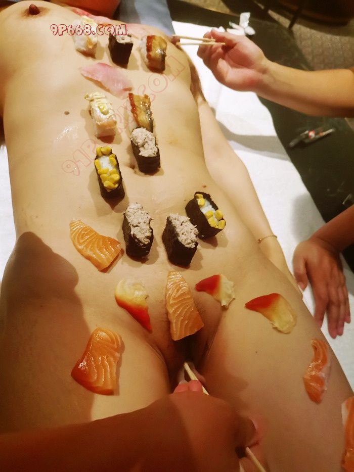 时机差不多了,我把眼罩给容容戴上,脱了她的衣服,然后让她躺在桌子上,我把寿司和刺身一件一件摆放在她身上,那种凉凉的感觉应该很刺激吧,然后我让丈夫和单男过来品尝“人体寿司”,我们三个男人就用筷子挑逗着容容,还用刺身沾了容容的淫水,吃起来会特别鲜美,特别与众不同,真是一次难忘的经历。