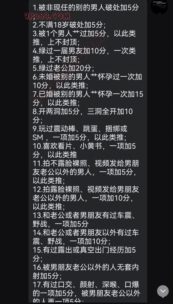 12.拍露脸裸照、视频发给男朋友老公以外的男人,一项加10分,以此类推;